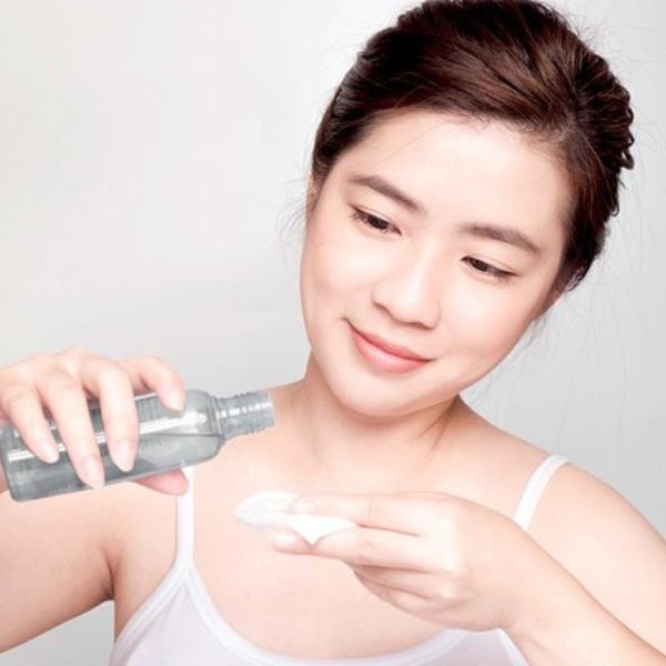 - Thấm một lượng nước hoa hồng vừa đủ vào bông tẩy trang hoặc xịt trực tiếp lên da.