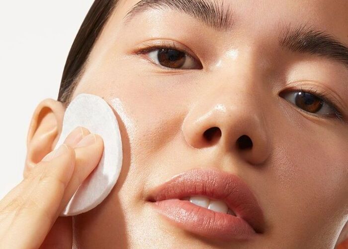 - Sử dụng bông tẩy trang thấm đều nước tẩy trang và nhẹ nhàng lau khắp khuôn mặt, chú trọng các vùng dễ tích tụ dầu thừa như vùng chữ T và vùng mắt.