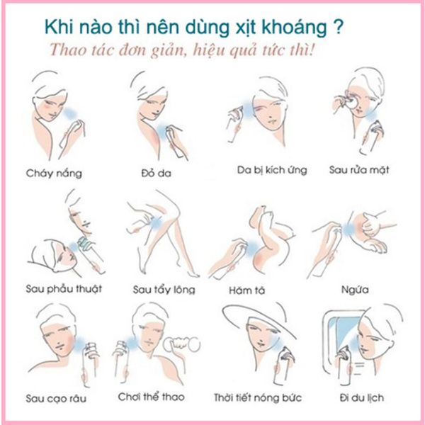Ngoài ra, chị em cũng có thể sử dụng xịt khoáng để làm dịu da sau khi đi nắng, sau khi tẩy lông hoặc sau khi thực hiện các thủ thuật thẩm mỹ.